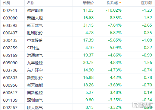 天然气板块持续低迷。佛燃能源跌停,新疆火炬跌超8%,新天然气跌超7%,胜利股份、中泰股份、九丰能源、新奥股份等跟跌。在大宗商品普涨之际,美国天然气价格跌至两周以来低点,昨日收于5.345美元/百万英热,跌幅为4%。原因之一可能是天气预报称截至10月底将比正常天气更温和,同时市场对欧洲能源危机蔓延的担忧有所缓解。据EIA统计,截至10月1日当周天然气库存增加1180亿立方英尺,这是自2020年6月以来最大增量。