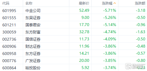券商股全线下跌。中金公司、东吴证券、国泰君安跌超5%,东方财富、国信证券跌超4%,财达证券、东方证券、广发证券、中信建投等集体下跌。