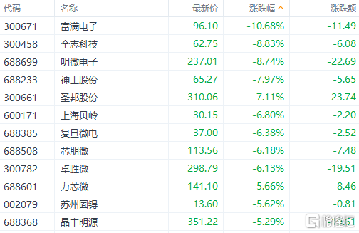 芯片股集体下挫。富满电子跌超10%,全志科技、明微电子跌超8%,神工股份、圣邦股份跌超7%,复旦微电、芯朋微、卓胜微等跌超6%。中信建投证券研报指出,当前芯片的需求虽然出现一定的结构性分化,但整体仍处于高景气度以及供需紧张的状态,今年未见产能紧张缓解或松动迹象。