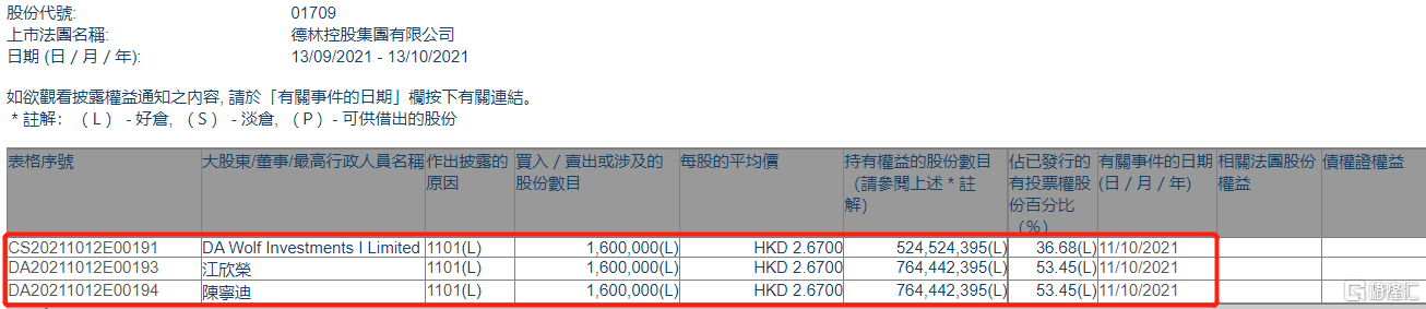 德林控股(01709.HK)获执行董事陈宁迪增持160万股