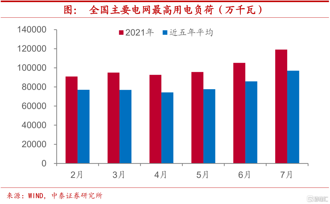 电荒多省蔓延,负荷远超同期。三季度以来,我国多个省市出现了“拉闸限电”的现象,特别是部分地区甚至居民用电也受到了影响,如9月29日辽宁省发布严重缺电II级橙色预警信号,决定全省启动有序用电II级措施。从全国主要电网最高用电负荷来看,今年以来明显高于过去五年同期平均水平,7月最高用电负荷接近12亿千瓦,而过去五年同期平均只有不到10亿千瓦。