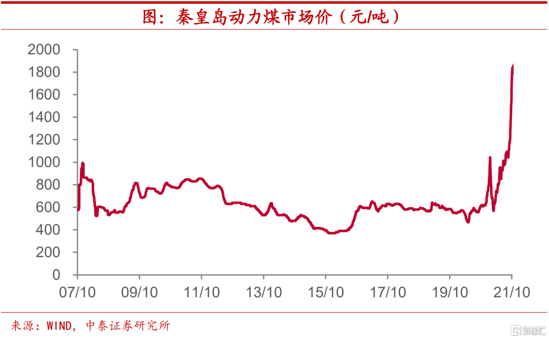 价格飙升,前所未见。在供需格局紧张的作用下,煤炭价格今年以来也是持续攀升。截止今年9月底,秦皇岛动力煤市场价较去年底上涨幅度已超过113%,价格绝对水平也已突破1500元/吨,而从2007年至2020年这十几年间,动力煤的最高价格也就在1000元/吨左右。