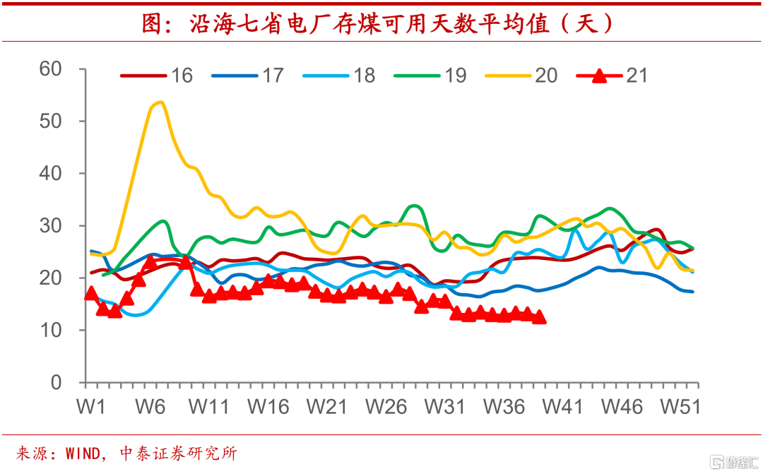 库存创下新低,去年同期减半。偏紧的供给和高企的价格,导致电厂煤炭库存严重不足。今年9月以来,沿海七省电厂存煤可用天数只有13天左右,创下2016年以来的同期新低,与之相对应的是,2019年和2020年同期存煤可用天数水平要超过25天,大约是今年的2倍左右。