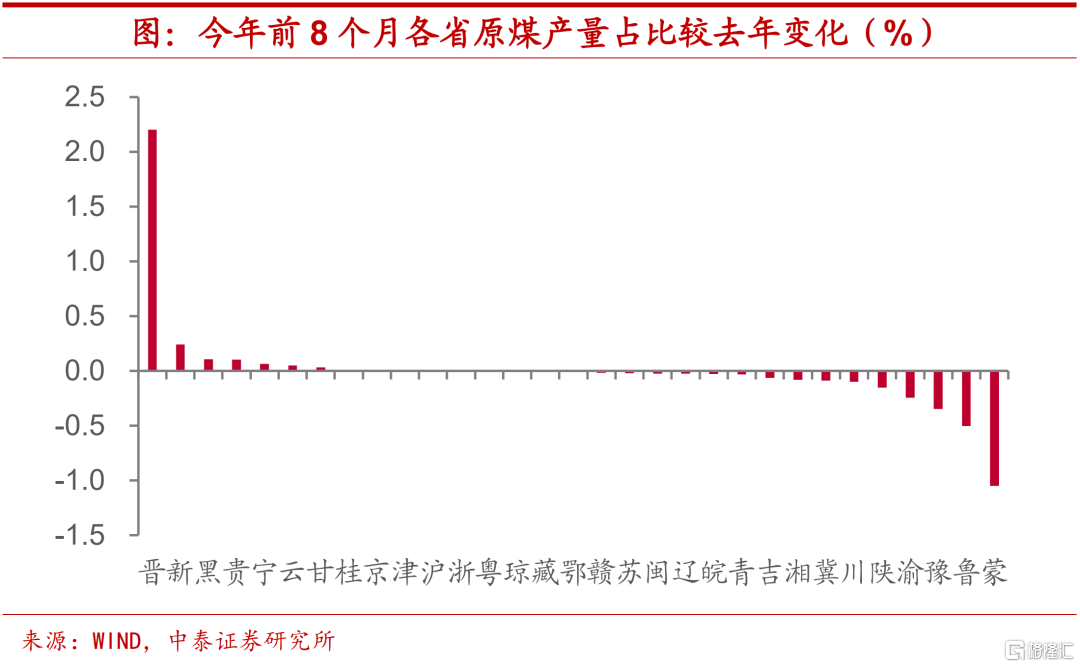 内蒙产出占比下滑,拖累煤炭整体供应。从地区煤炭产量上来看,今年煤炭供给的拖累主要是来自内蒙古。整体而言,我国煤炭供应的集中度较高,内蒙古和山西作为煤炭的生产大省,两者的原煤产量能占到全国一半左右,而加上陕西的话,三者原煤合计产出接近全国的七成。但今年前8个月,内蒙古原煤产量占比较去年底下滑超过1个百分点,在全国各省市中排名垫底,这无疑加剧了煤炭供应的紧张程度。