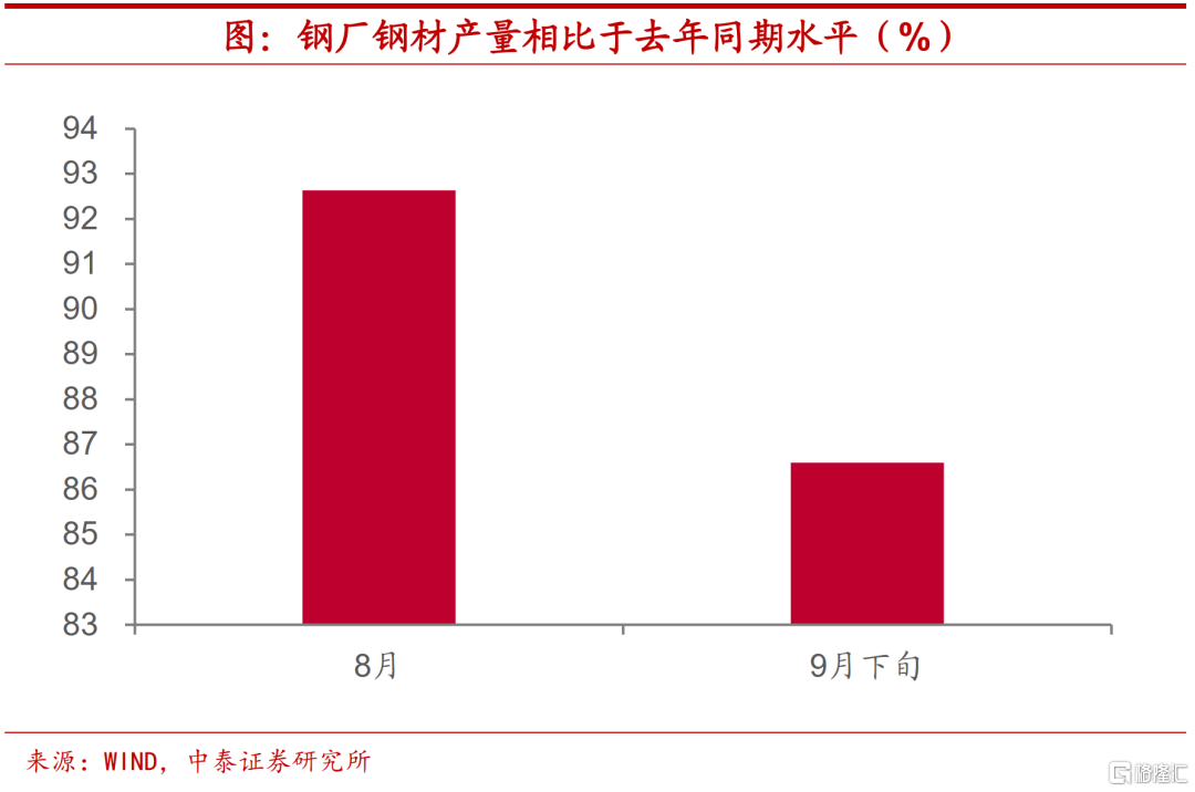 行业影响差异悬殊。事实上,在能耗双控和煤炭短缺等多重因素导致的限电限产情况下,不同行业受到的影响存在着显著差异。以钢铁行业为例,今年8月钢厂钢材产量大约相当于去年同期的92.6%,但是限产限电趋严的9月下旬,钢厂钢材产量下滑到去年同期的86.6%,这意味着限产限电对于钢铁行业的影响约在6个百分点。我们同样整理了如化工等部分高耗能行业的开工率情况,结果同钢铁行业大体类似。但是,对于耗能占比较低的行业而言,生产限制可能并不显著,比如屠宰厂开工率相较往年同期水平变化不大。