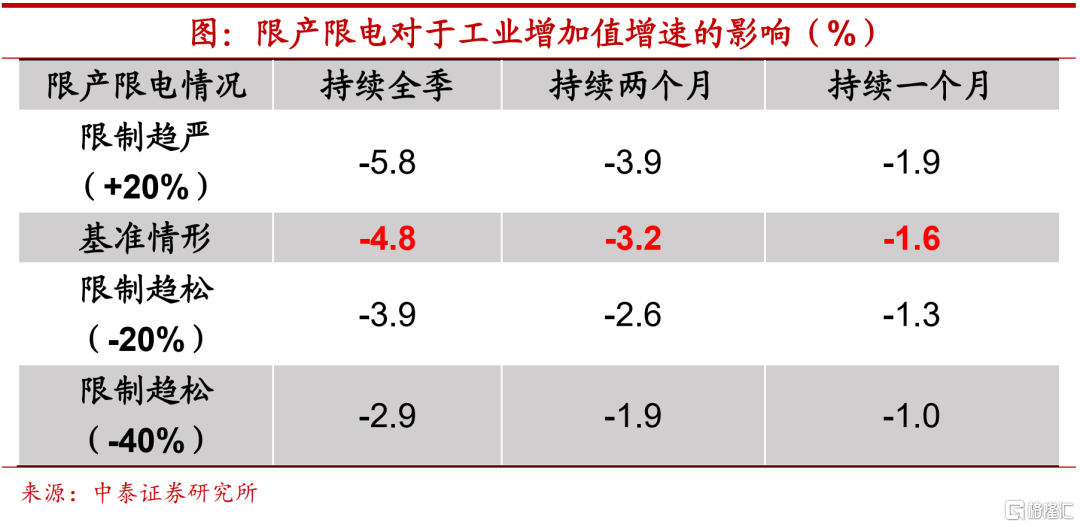中性假设条件下,拖累经济增长超1个百分点。据此我们估算本次限产限电对于经济增长的影响,测算结果表明,在基准假设下(当前限产限电强度),若政策持续两个月,对于工业增加值增速的拖累约为3.2个百分点,再根据工业增加值与GDP之间的关系,此种情形下,限产限电或将拖累经济增长1.2-1.3个百分点左右。不过,随着后续保供措施的落地见效,限制程度或将比9月下旬以来有所缓和,对经济的拖累可能要小于我们估计的中性情况。