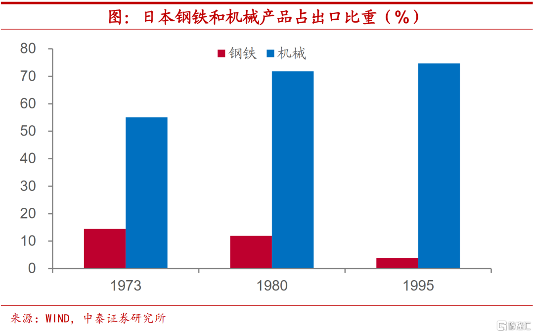 日本的转型经验就充分表明了能源价格提升对于产业结构的影响。在遭遇石油危机带来的成本冲击之后,日本着力摆脱过去对于能源和燃料等资源的过度依赖,推行“技术立国”,特别是通过电子技术革命推动日本产业结构迈向高级化,发展知识和技术密集型行业。从日本出口结构上来看,这一时期钢铁等重工业品占比不断下降,机械等资本品出口比重显著上升。