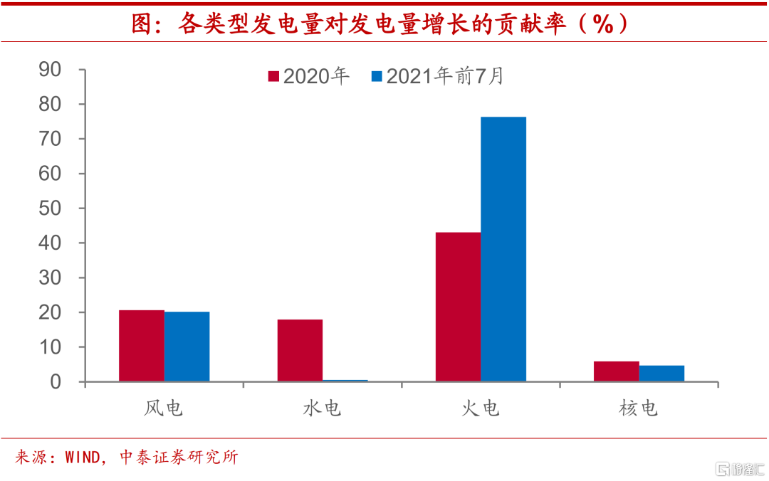 火电依赖上升,水电表现不佳。不过,从发电结构上来看,今年水电表现明显不及去年,而对于火电的依赖显著上升。2020年全年水电对于发电量增长的贡献率接近18%,而今年前7个月几乎归零,与之形成鲜明对比的是,火电对于发电量增长的贡献率由去年的43%一举提升至超过75%。