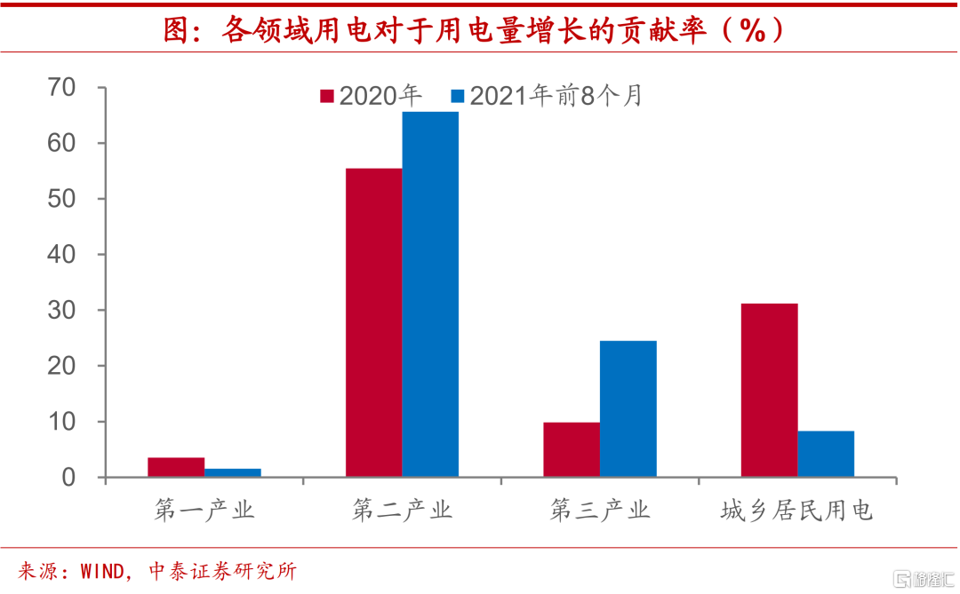到底谁是今年用电大户?三季度以来,我国多个省市出现了“拉闸限电”的现象,特别是部分地区甚至居民用电也受到了影响,而今年全国主要电网最高用电负荷明显高于过去五年同期平均水平。不过,一方面,从电力供应上来看,发电设备似乎并未开足马力。而另一方面,从电力需求情况上来看,经济增长和发电量之间的关系依然稳定,并未出现较大程度变化,用电增长也并未对发电系统提出超出以往水平的过高要求。发电量的高增速和经济增长状况类似,都是受到去年同期低基数的影响。从发电结构上来看,今年水电表现明显不及去年,而对于火电的依赖显著上升。今年前7个月火电对于发电量增长的贡献率由去年的43%一举提升至超过75%。从用电端来看,今年以来第二产业对于用电量的增长贡献最为突出,但相比于去年,第三产业的改善幅度更大。从制造业行业来看,其实今年高耗能行业的用电量增长相对而言并不算快,在政策严控下得到了一定程度的约束。