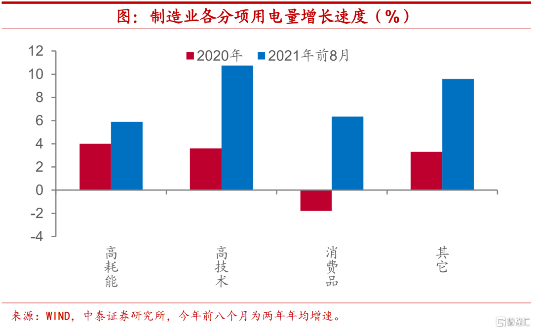 高技术行业增速领跑,高耗能用电存在约束。从制造业中各类行业的表现上来看,其实今年高耗能行业的用电量增长相对而言并不算快,在政策严控下得到了一定程度的约束,今年前八个月高耗能制造业用电量两年年均增速不足6%,较去年提高不足2个百分点,而高技术制造业用电量两年年均增速超过10%,消费品制造业的两年年均增速也要超过高耗能行业。