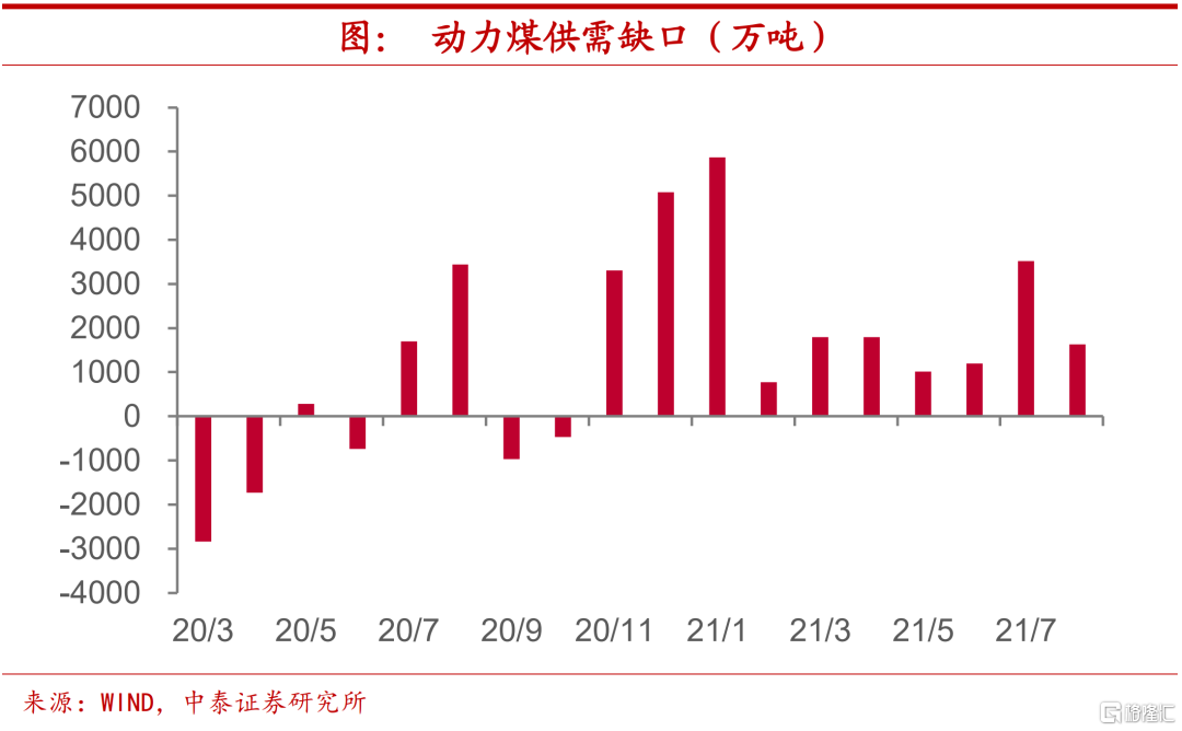 供需偏紧,缺口较高。结合前文分析,今年发电对于火电的依赖度明显上升,因此,我们认为,“电荒”的根源还是出在煤炭供应上。根据我们的估算,今年以来煤炭供需就相对偏紧,并未出现往年在个别月份能够看到的供给超出需求的现象。3月以来动力煤的供需缺口一直维持在1000万吨以上。
