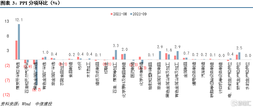 PPI环比上涨1.2%(前值0.7%)。生产资料价格上涨1.5%(前值0.9%),涨幅扩大。受需求旺盛叠加供应持续偏紧影响,煤炭加工业、开采和洗选业价格上涨18.9%、12.1%,合计影响PPI上涨约0.50个百分点。部分高耗能行业如有色金属、水泥、化工品、钢铁生产受限,价格不同程度上涨,天然气价格受国际市场带动也有上涨,铁矿石价格受钢铁产量收缩预期价格大幅回落8.7%。生活资料价格连续2月持平,弱于季节性平均水平,也体现出原材料价格上涨对生活资料价格传导有限。