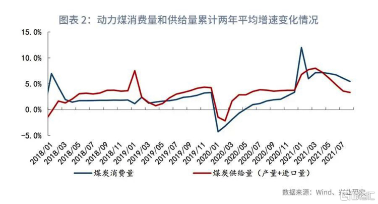 截至8月,我国动力煤消费量累计两年平均增速达到5.4%,而同期煤炭供给量(包括国内产量和进口量)的累计两年平均增速仅为3.3%。2021年以来,我国高耗能行业保持高速增长,电力需求激增,动力煤消费量大幅走高。但是同期,由于澳煤停运、国内煤矿环保安全检查限产,整体的动力煤供给量增速弱于消费量增速。