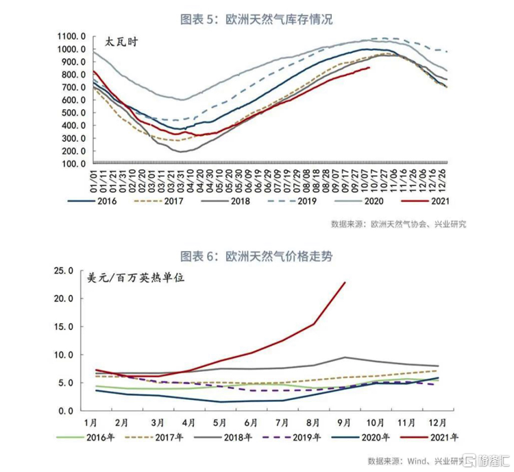 2021年9月,欧洲地区天然气库存约为10107.6太瓦时,与2020年同期相比下降了23.9%。但是今年随着欧洲经济的复苏,天然气消费量高于2020年。这加剧了欧洲天然气能源危机。9月欧洲天然气价格较2020年同期上涨了近5倍。全球天然气价格的飙升带动了国内相关行业价格上行。