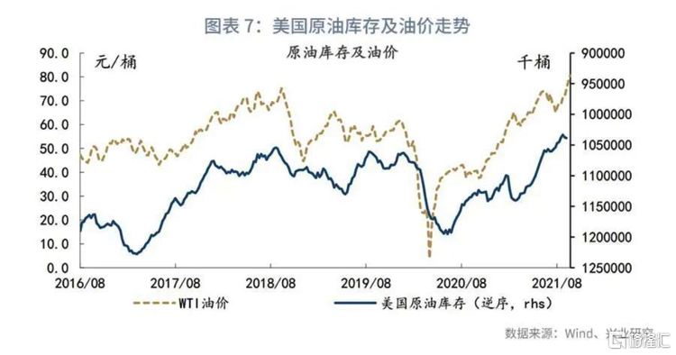 此外,受多方因素影响,美国原油库存持续走低,原油价格持续回暖。一方面,美国经济回暖带动原油消费量回升;另一方面,墨西哥湾飓风来袭,美国原油供应链受损,加之OPEC+保持严格限产,9月原油价格持续回升,当前已突破80美元/桶。原油价格上涨,将带来国内化工、炼油等行业成本上升,推高工业品价格。