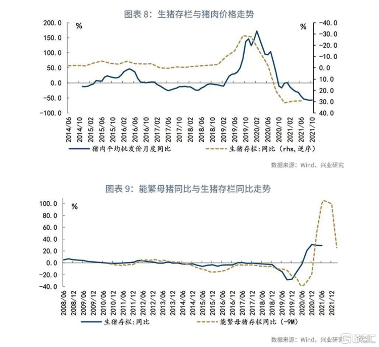 2021年9月,猪肉价格环比由8月的-1.4%进一步降至-5.1%,猪肉价格持续下跌。2021年9月,猪价同比为-46.9%,对CPI同比的拉动值约为-1.3个百分点。当前,猪价俨然成为CPI同比的主要拖累项。猪价的走势与生猪存栏量密切相关。能繁母猪同比领先生猪存栏量3个季度左右。从数据来看,生猪存栏量的上升或一直持续到2022年上半年。不过由于年初北方疫情影响生猪补栏,今年冬天生猪供应或受到一定影响,猪价或出现阶段性反弹。