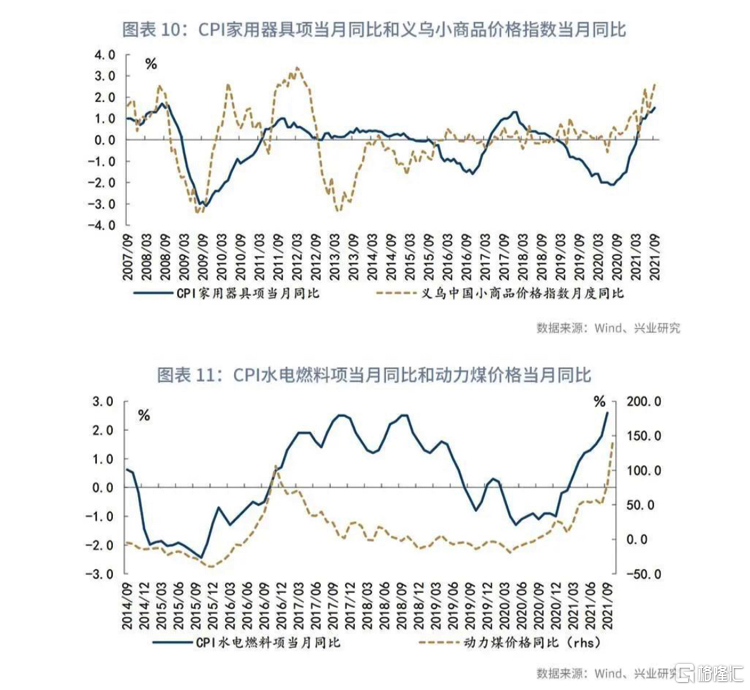当前,CPI与PPI呈现出进一步拉大的态势。不过,在部分分项上,PPI上行仍在一定程度上对CPI造成影响。我们可以发现,自2020年第二季度以来,义乌小商品价格指数持续走高,CPI家用器具项当月同比亦稳步回升。同时,CPI水电燃料项当月同比与动力煤价格同比亦自2020年第二季度起呈现出同步回升的态势。