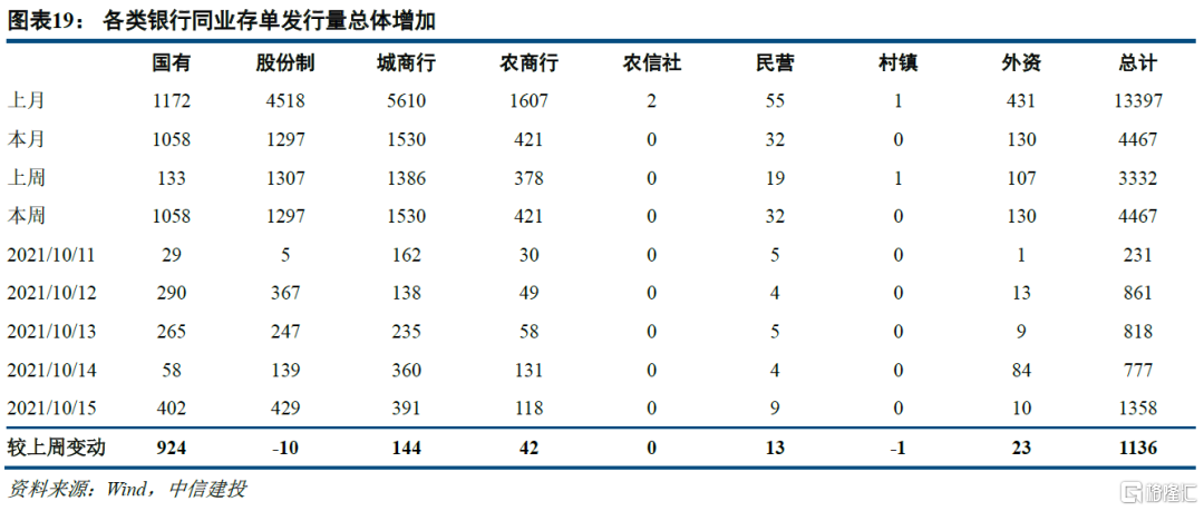 从银行类型看,规模方面,国有银行本周发行存单1058亿元,较上周增加924亿元;股份制发行1297亿元,较上周下降10亿元。城商行、农商行等的发行规模也均有所上升。总体上,本周同业存单发行以国有行、城商行、股份行为主。发行利率方面,国有银行上行明显,国有行、股份行发行利率较上周分别上行16.2 BP、3.2BP,平均上涨1.4BP,主要是国有行发行期限较长、发行量较大所致。