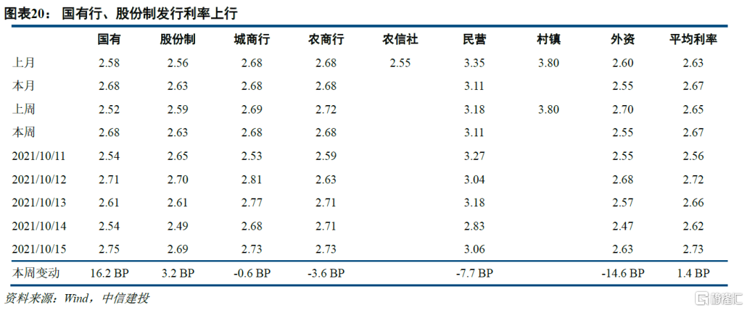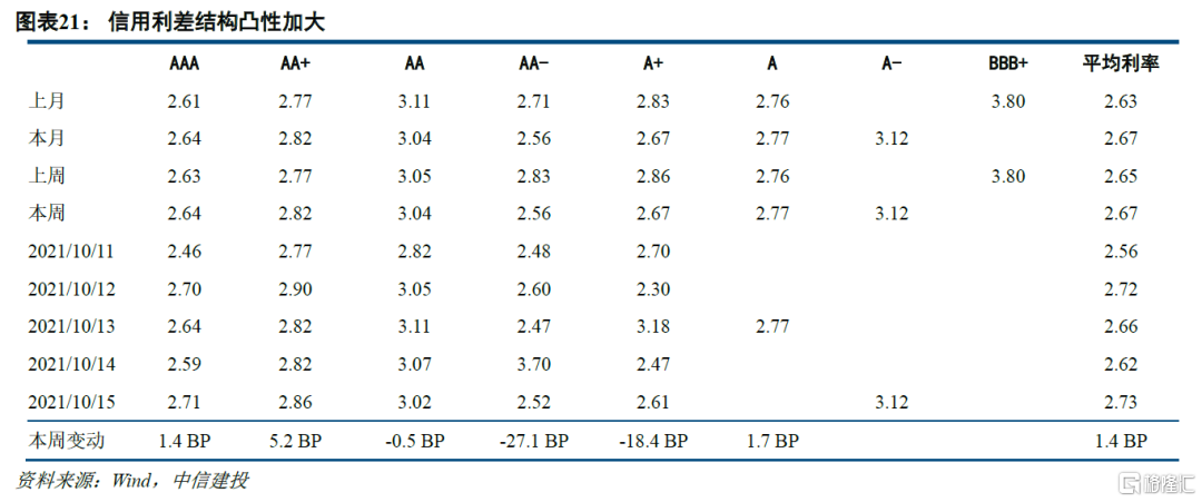 从发行人评级看,AAA、AA+评级发行人发行利率均有所上行,分别上行1.4BP、5.2BP,信用利差结构凸性加大。