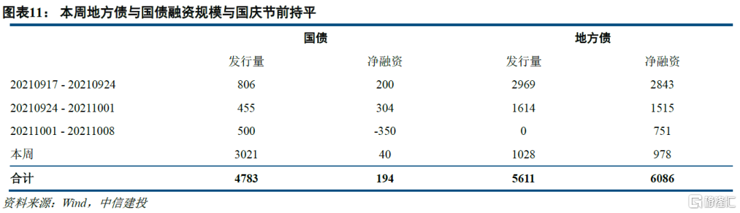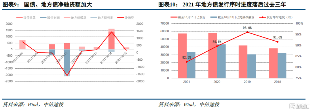 10月11日至15日央行公开市场合计净回笼4600亿元,等量续作5000亿元MLF。下周公开市场到期压力较小,共计600亿元逆回购到期。考虑到地方债发行加速及巨量央行投放资金到期,预计央行根据调控需要,等量或小幅增量投放7天逆回购品种,以保持流动性合理充裕。