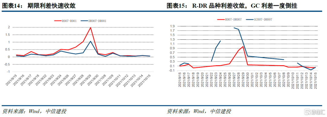 10月11日至15日,央行公开市场逆回购到期5100亿元,均为国庆节前投放14天品种,同时累计进行500亿元7天逆回购操作,同时等量续作5000亿元MLF,全周累计净回收4600亿元。如我们国庆节前预测,央行并未实施降准以替代到期MLF,且孙国峰司长再次在会议上表达了央行调控流动性的基本思路和政策导向,四季度降准的可能性也在进一步趋低。在大量资金回笼叠加税期的情况下,上周DR007加权平均利率的振幅在5BP上下,也显示出市场流动性实际上并未出现实际的紧张。