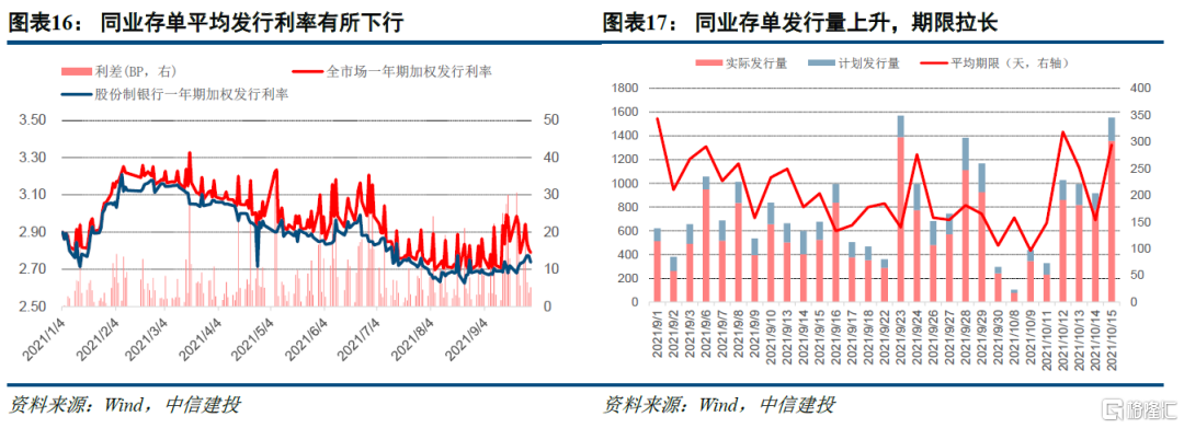 本周同业存单发行踊跃,受假期影响,15日当天实际发行量达到1358亿元,平均发行期限拉长至8个月左右水平,主要受国有大行和股份制银行集中续发行1年期品种影响。全市场一年期加权平均利率约为2.81%,较上周下行4bp;股份制银行一年期加权平均利率约为2.75%,较上周下行2bp。