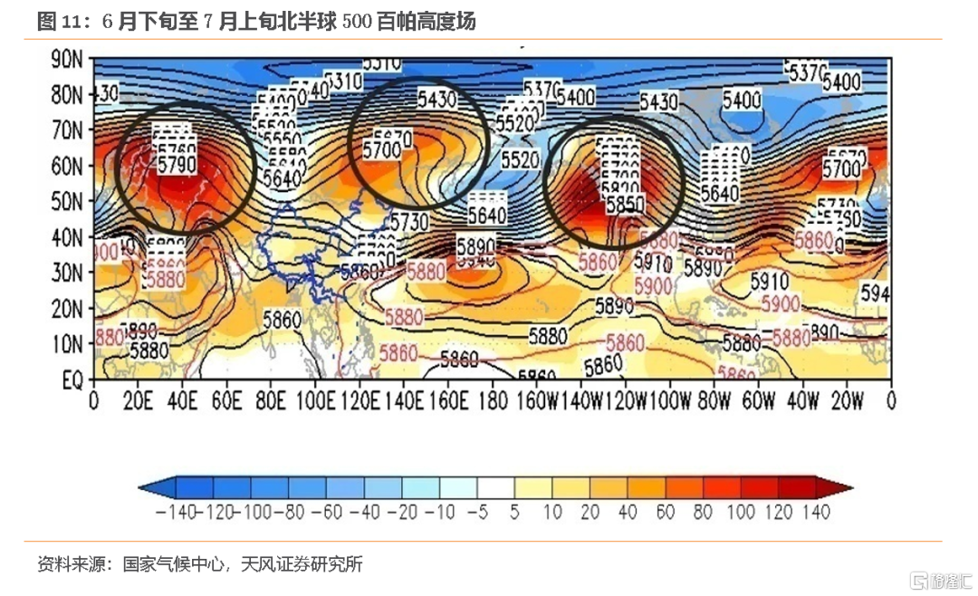 根据国家气候中心的监测,今年6月下旬到7月上旬西风带出现了四个高压脊,图中的三个圆圈区域分别为欧洲、俄罗斯远东地区、北美西部上空的三个高压脊中心,还有一个位于北大西洋。