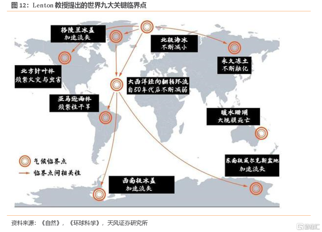 2019年11月《自然》杂志上,英国埃克塞特大学Tim Lenton教授列出了全球气候系统的九大关键临界点:北极海冰不断减小、格陵兰冰盖加速流失、北方针叶林频繁火灾与虫害、永久冻土不断融化、大西洋经向翻转环流不断减弱、亚马逊雨林频发性干旱、暖水珊瑚大规模死亡、西南极冰盖和东南极部分地区加速流失。