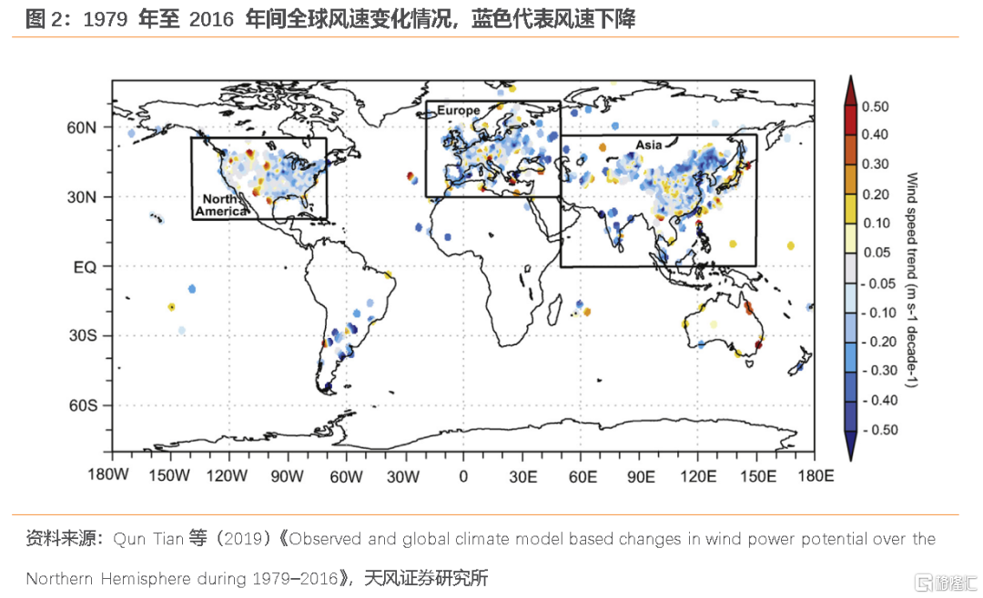 根据Qun Tian等(2019)的研究,1979年至2016 年间全球73%的站点出现了风速下降,北美、欧洲和亚洲分别约有 30%、50%和80%的电站损失了超过 30% 的风电潜力。