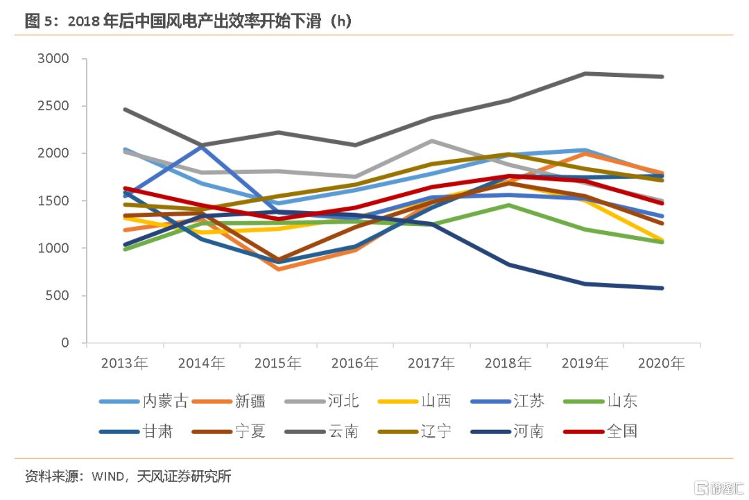 考虑到2018-2020年我国风电利用率分别为93%、96%、96.5%,说明风电产出效率的下降并不是因为弃风问题恶化,而可能是因为风速的放缓。