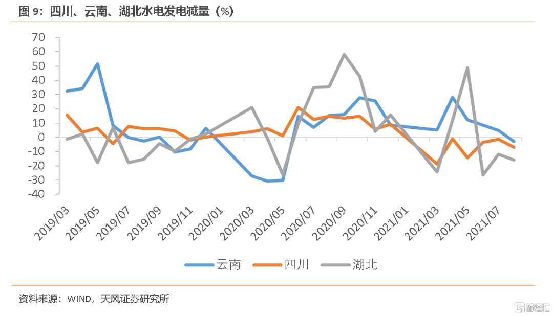 我国水电装机容量最高的三个省是四川、云南和湖北,但今年澜沧江和金沙江上游降雨量偏低、来水偏枯,四川、云南和湖北的水电供给明显减少,8月水电产量分别同比下滑6.9%、2.8%和15.9%。