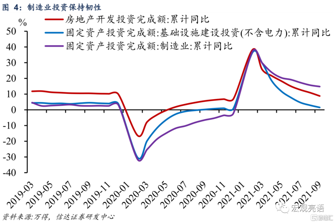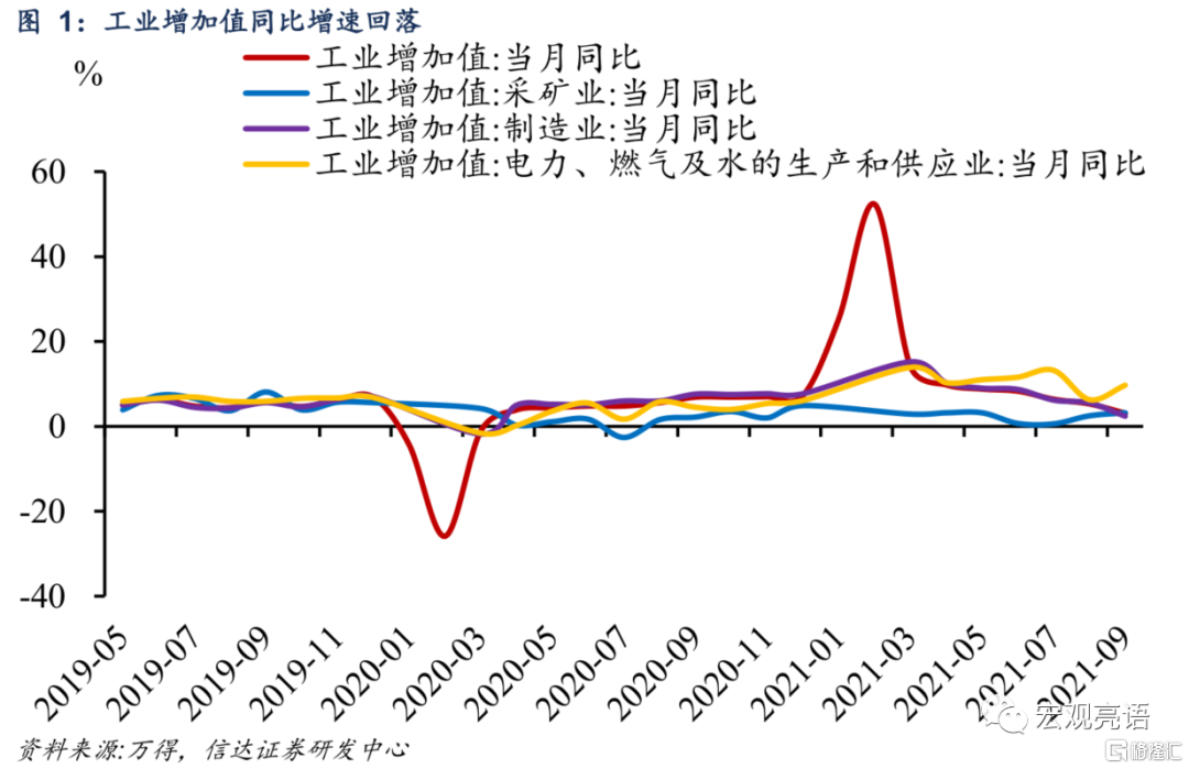 能耗双控导致工业增加值增速放缓。9月地方政府对于高能耗行业产能压降的力度有所加大,粗钢产量环比下降11.4%,水泥产量下降4.7%。黑色金属冶炼、有色金属冶炼、化学原料、非金属矿物等中上游行业增加值增速均出现明显下降。结合《投入产出表》中各行业增加值占比,我们估算得出这4个高耗能行业的产能受阻拖累工业增加值约1.2个百分点。在能耗双控、环保限产政策的压力下,工业生产预计会持续受到影响。另一方面,出口产业链继续对工业生产起到重要的支撑作用,计算机通信、专用设备、电器机械等行业增加值维持高增长。