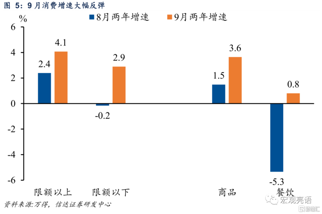 疫情扰动减弱,消费有所反弹。从结构上来看,第一,疫情扰动减弱,加上中秋节外出需求增加,餐饮消费显著好转。第二,手机等通讯设备消费大幅回升,和iPhone新机发布有关。另一方面,“缺芯”对汽车消费形成抑制。收入延续修复,但边际消费倾向有所回落。