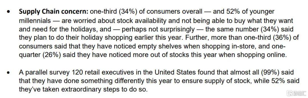咨询公司埃森哲最新的调查显示,34%的美国消费者担忧假期期间无法买到自己想要的商品,同时有34%消费者计划今年提前圣诞节购物,以确保商品能在圣诞节前到货。去年,美国有超过100万个圣诞节订单没能在节前到货。