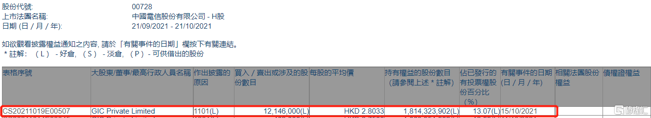 格隆汇APP获悉,根据联交所最新权益披露资料显示,2021年10月15日,中国电信(00728.HK)获GIC Private Limited在场内以每股均价2.8033港元增持1214.6万股,涉资约3404.9万港元。