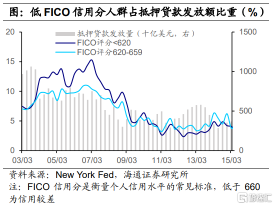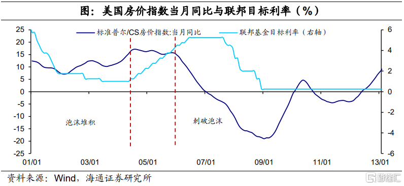 加息刺破了房地产泡沫。2004年起,美联储为抑制通胀而收紧货币政策,自2004年6月至2006年6月连续17次加息,基准利率由1%提高至5.25%,这限制了居民新增贷款,从而使得购房需求明显减弱,刺破了堆积已久的房地产泡沫,造成房价的下跌。2007年开始,美国房价从高位一路走低,至2008年末,全国OFHEO房价指数下跌8.5%,而衡量20个大中城市的标准普尔/CS房价指数下跌24.5%。
