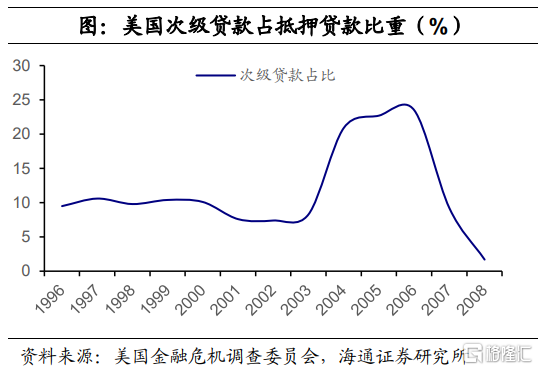 在危机发生的前几年,由于美国政府政策的激励,金融机构宽松的信贷条件,以及对房价长期上涨的预期,很多不符合贷款条件,如没有收入和资产、没有工作、信用评分较差的购房人,也能成功取得贷款,这一类贷款即为“次级贷款”。在2003-2006年间,美国抵押贷款中次级贷款的比重不断升高,在2006年接近25%。