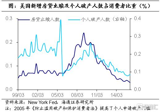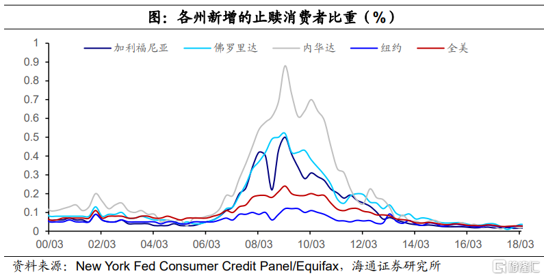 从区域来看,个人违约和破产集中发生在房价跌幅更大的区域。房价跌幅越大,资产贬值、出现个人负资产的情况也就越多,违约和破产的概率就越大。其中,加州、佛州、内华达州的新增止赎者比例远超全美的平均水平,相比而言,房价跌幅较小的纽约州,止赎消费者的比重就相对较低。