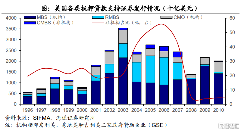 最直接受影响的就是抵押贷款证券(Mortgage-backed Securities,MBS)相关的金融机构。MBS原本主要以吉利美、房利美和房地美三大GSE发行,即机构支持MBS,但在2002-2006房地产泡沫堆积期,由于存在大量投机套利机会,大量其他金融企业也参与到MBS的发行中,至2006年有40%的MBS为非机构支持的,但这类产品中由于监管不力,隐含更多风险。