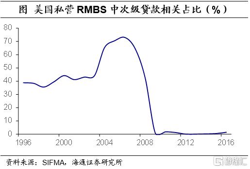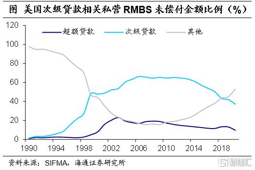 尤其是其中的住房按揭证券(Residential Mortgage-backed SecurityRMBS),是将次级贷款证券化的主要产品之一,次级贷款相关产品占私营RMBS的比重一度接近80%2007年开始,次级贷款相关RMBS的未偿付金额占比不断升高,最终导致2008年私营RMBS市场大幅崩盘。