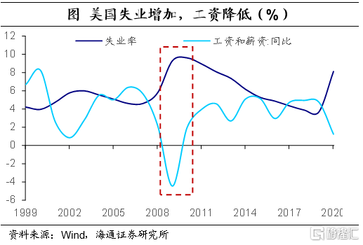 房地产泡沫的破灭如何影响实体经济?一方面,金融系统的崩溃导致信用紧缩,企业融资更加困难,从而影响了生产和就业。美国工业生产指数在2009和2010年分别下降了19.2%和14.2%。与此同时,经营困难的企业开始大范围解雇员工,使得失业率快速升高,在2009年达到9.28%,是1983年以来的最高值,而即使还保有工作的劳动者,其薪酬也被降低,2009年企业支付的工资和薪资较前一年下降4.4%,这使得美国居民的收入减少,对消费产生负面影响。