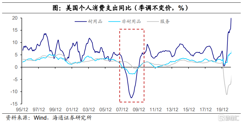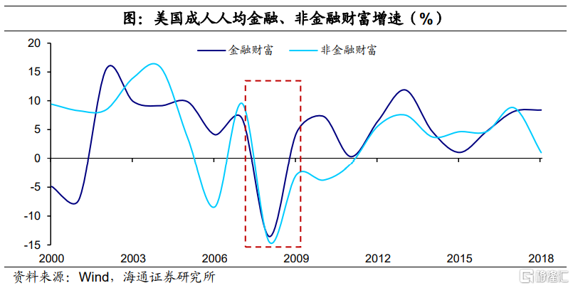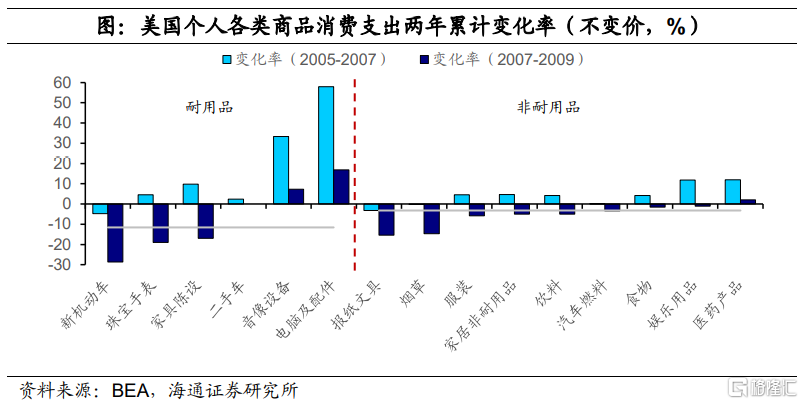 在其他商品消费中,越是 “非刚需”,消费下降幅度更高。具体来看各类商品消费的变化,我们比较了2007-2009年和2005-2007年消费支出增速,发现几乎所有类别的消费增速都出现了明显下滑,而且耐用品的下滑程度更大。但无论是在耐用品还是在非耐用品中,下降幅度更大的往往是“非刚需”的消,例如耐用品中的新车、珠宝,非耐用品中的报纸文具、烟草、服装等等。不过,当时正处于消费电子的高速增长期,虽然音像设备、个人电脑的消费增速也出现了大幅下滑,但绝对增速仍保持在10%左右。