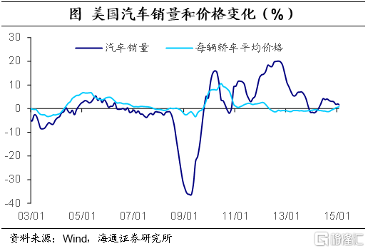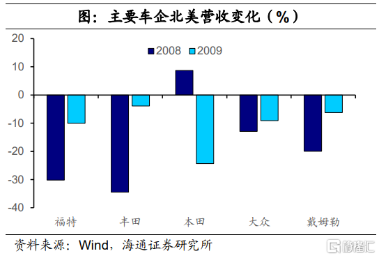 一个值得关注的重点是,在非住房相关行业中,汽车消费受到的冲击是最大的。这是由于汽车的价格相对较高,其受到家庭财富变化的影响要明显大于受到收入的影响。在这次危机中,家庭财富贬值的幅度更大,这就使得汽车消费也遭遇寒冬。从数据来看,2009年初美国汽车销量同比下降接近40%,而平均价格也有一定程度的下降。这使得全球车企在北美的营收大幅下滑,尤其是福特、丰田等以美国为主要市场的车企。