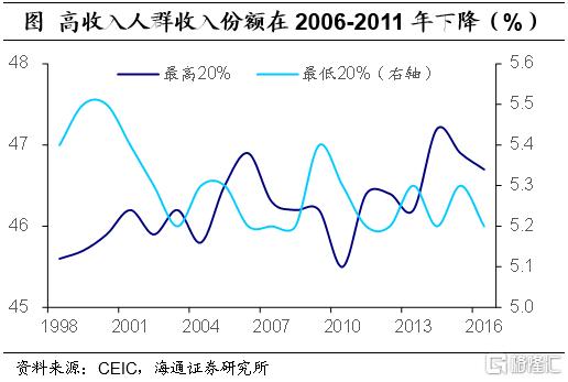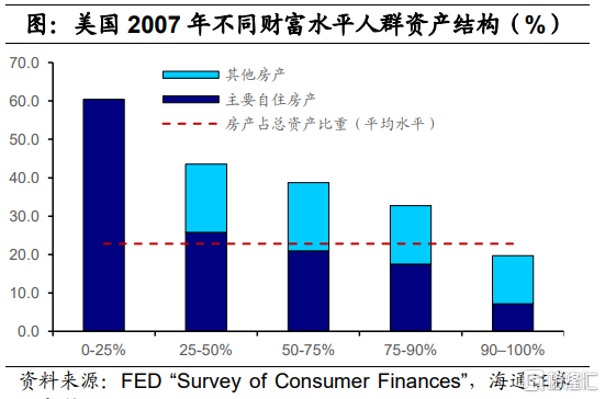 首先,按贫富水平来区分,在危机中不同收入、财富阶层均受到冲击,但程度有所不同。从收入水平来看,高收入人群的收入份额在2006-2010年不断下降,一个重要的原因是高收入的金融行业是这次危机的重灾区,导致这部分高收入人群失业、降薪。而从财富水平来看,较低财富水平的家庭,其房产占总资产的比重更高,房价的下跌使得家庭财富大幅贬值。相对而言,贫富阶层受损的主要原因不同,由于房产等资产贬值的幅度要大于收入下降的幅度,较贫穷的群体受伤更严重。