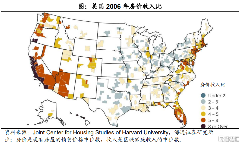 从区域来看,东西海岸的加州、佛州是泡沫最严重的区域。一般认为房价收入比在4-6倍之间的房地产市场是健康的,超出这一比例则说明房价过高、存在泡沫,从2006年各州的房价收入比来看,房价收入比高于8的地区集中在加利福尼亚和佛罗里达,而其他地区的房价相对来说还在合理区间。这两个地区房价过高,一是因为经济发达、需求旺盛,但建设成本过高、供给相对短缺,二是因为这两个区域的海外投资者较多。