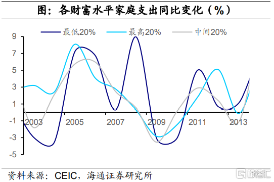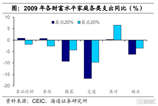 从家庭支出的整体变化来看,不同贫富阶层消费支出下降的幅度非常接近,几乎没有太大的差异,但从结构上看却有所不同。这种差异的来源,是因为富裕阶层相对而言收入和财富都有所下降,而较贫穷的阶层财富下降的幅度较大。反映在消费结构上,由于富裕阶层相对收入减少更多,其减少了在食品饮料这类必需消费上的支出;而财富水平较低的阶层则受家庭财富缩水影响,减少了对汽车等耐用品的消费,也减少了对服装、娱乐等“非必要”消费的支出。