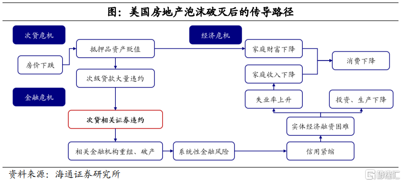 最后,我们总结了美国2007年房地产泡沫破灭后的传导路径。即“房价下跌—影响金融市场—影响实体经济”的三重影响链条。房地产价值的下跌,导致抵押贷款的抵押物贬值,造成违约,这将率先引发金融部门的危机。房价下跌又通过两个渠道影响实体经济,一方面家庭财富的贬值、企业资产的缩水,直接对实体经济造成冲击,另一方面,金融部门的危机造成融资环境的紧张,从而进一步危及实体经济。