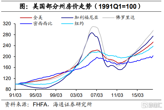 我们发现,跌幅最大的正是前期积累泡沫较为严重的区域。从各州房价走势来看,前期地产泡沫最大的加州和佛州跌幅最大,截至2009年第一季度,分别较最高点的2006年第一季度下跌了42.6%和36.9%,而全美平均仅下跌11.9%。并且,直至2019年,加州和佛州的房价才回到最高点的水平。而与之相比,无论是人均收入较高的纽约州,还是收入较低的密西西比州,房价的跌幅都相对较小,并且房价在2014年左右就逐步恢复到了之前的水平。