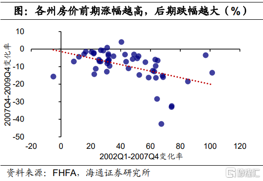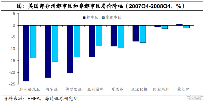 从各州内部来看,在跌幅越高的州,都市区的跌幅要明显高于非都市区,而在跌幅较小的州却没有这个表现。一个可能的原因是,在这些房价被炒作的区域,都市圈的房屋由于更具有投资价值和升值可能,被高估的程度也越多,这使得其在泡沫破灭后降价的幅度更大。