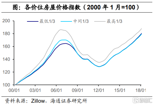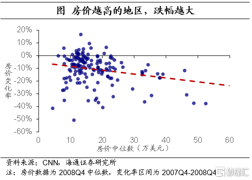 从价格上看也是如此,更贵的房子相对来说跌幅更大。我们分析了美国100个重要都市圈的数据,发现2006年房价中位数更高的都市圈,在2007年第四季度至2008年第四季度跌幅更大。
